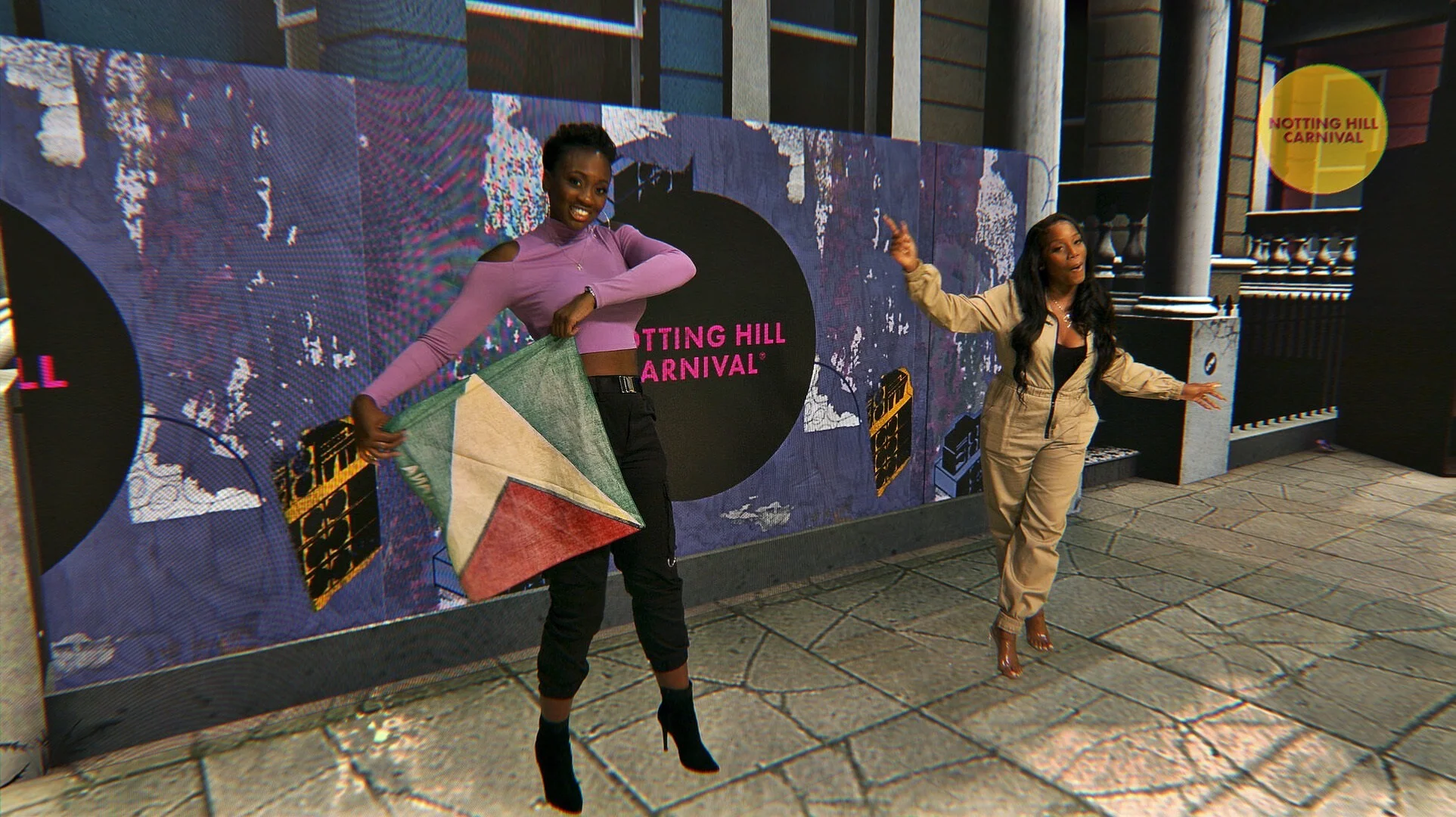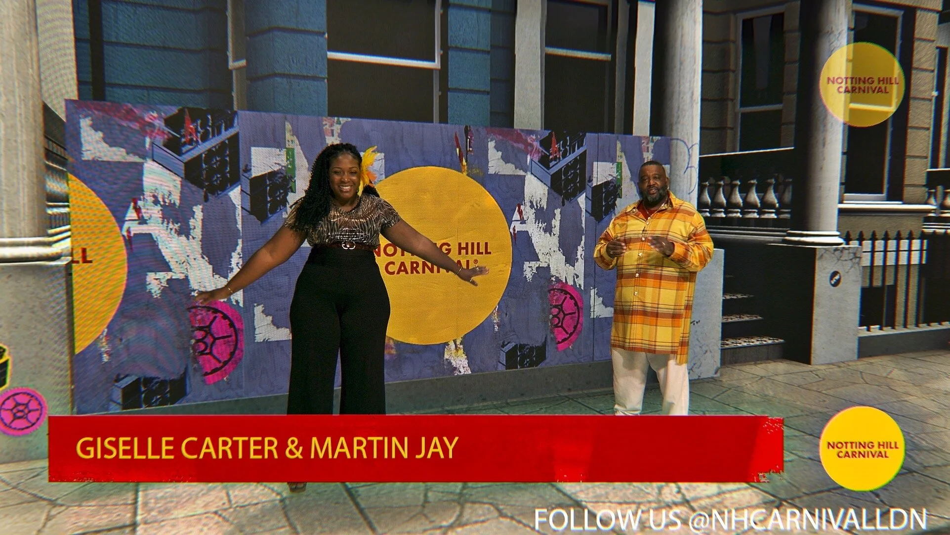 I was comissioned by Pixels & Noise to create 2D animations for the Notting Hill Carnival live stream, the first of its kind due to the pandemic. Filmed in an LED XR stage It was amazing that they were able to pull off such a complicated concept! I helped design and then animate the complete graphics package. We wanted to replicate something that felt real, as if the presenters were truly out in the street, so we made fly posters and painted logos using the Notting Hill branded imagery on virtual hoardings behind the presenters. I created alphas with a roller paint aesthetic to house video content on the panels. We used this look to create broadcast overlays, and lower thirds etc. We created different versions to show some wear and tear to the panels as the weekend progressed. As with all things Lewis, I was able to work at the ‘content’ side of things feeding in to the production pipeline, creating loops and seamless content that could be triggered in the timeline throughout the weekend. Lewis also created and textured a 3D model of a Notting Hill street, including a little cat!