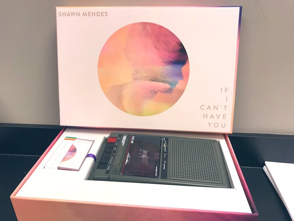 Following on from making visuals for the tour at Treatment, Shawn Mendes’ team chose to use a frame from one of my animations as the artwork for his new single. This was rolled out across a social media campaign along with imagery and elements from my original designs. Souvenir ‘retro’ cassette tapes in crystal pink went on sale and promotional cassette players sent out to various celebrities (and me) - it made me feel very touched, and old!